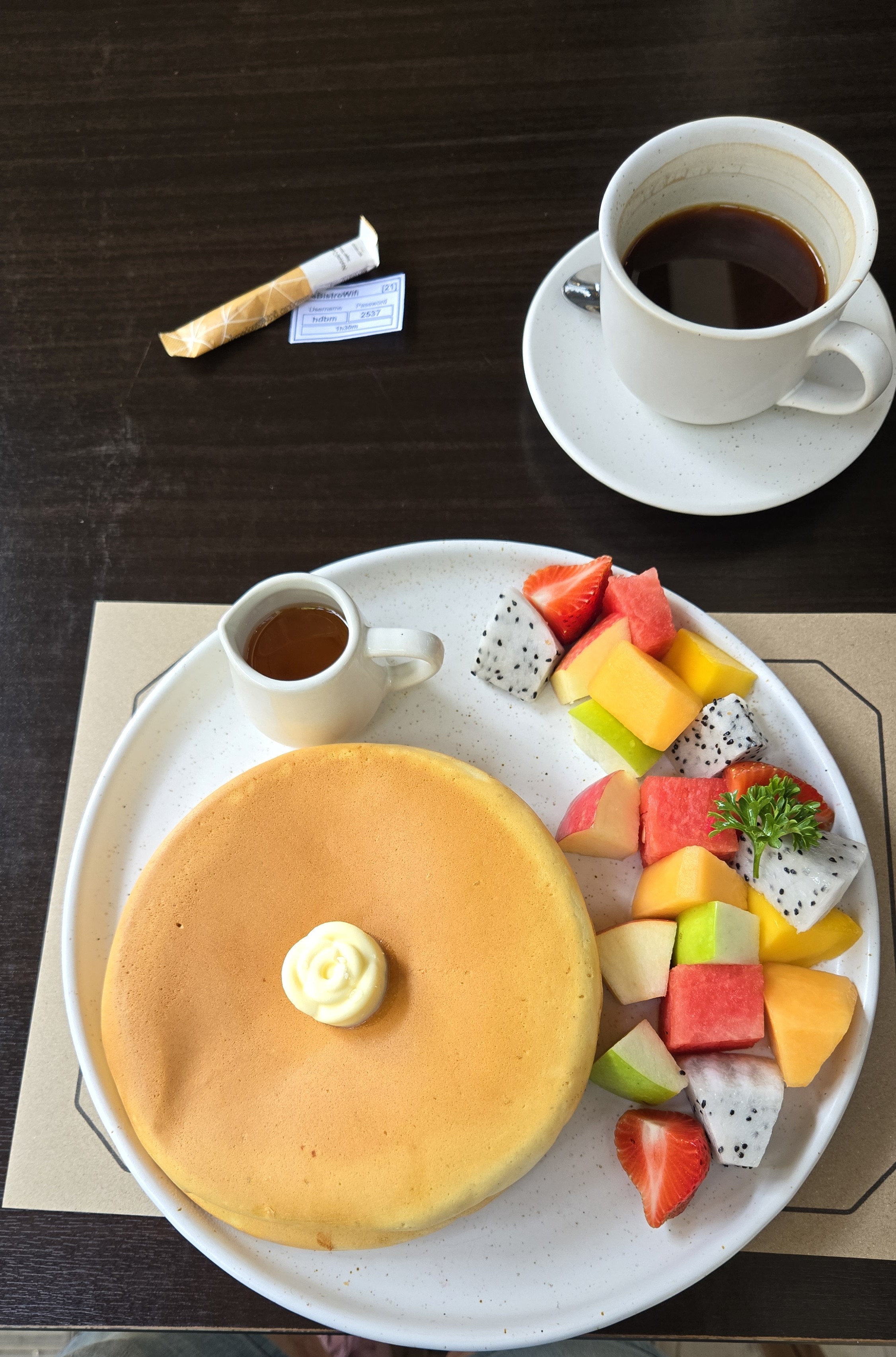 The presentation of my breakfast was another wonderful surprise. There they were…two good-sized pancakes with a variety of colorful fruits on the side. I tucked in eating as much as I could. They were melt in your mouth delicious but filling as pancakes can be. I couldn’t finish them so I discretely wrapped what was left in a napkin and stuffed them in my bag. I should also mention that my Americano coffee was also delicious.