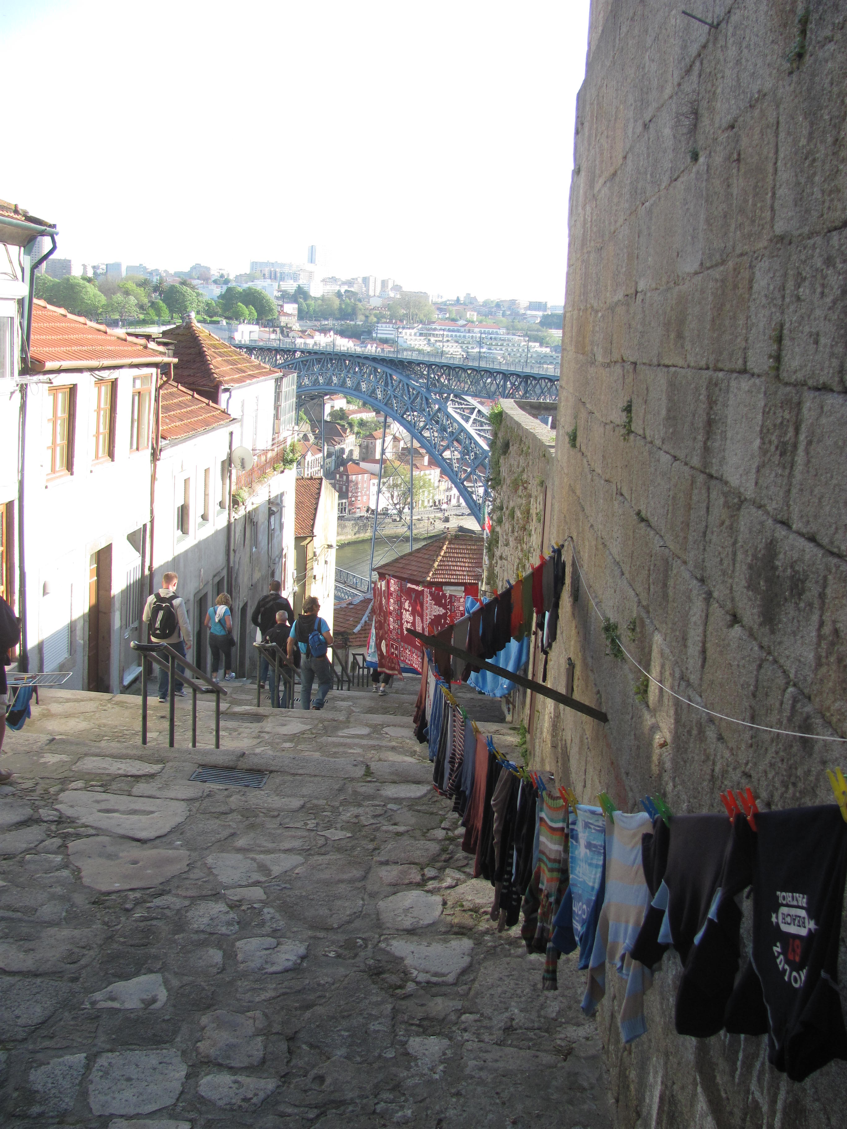 On our return to Porto, we were faced with several options as to how to cross over the two level bridge. We could have used a cable car for 5 euro each, or the metro train for one and a half euro, or walk back across on the lower level from whence we came, or take a funicular up to the higher level at a cost, of course, or lastly dare to climb up the cobblestone street leading on to the higher level to not only walk across for free, but also have the best view possible. We opted for the last because we already had spent enough money for this day, and we were glad we did. Making stops along the way helped, and viewing the port scenes from such a height for the last time made it all seem much more worthwhile.