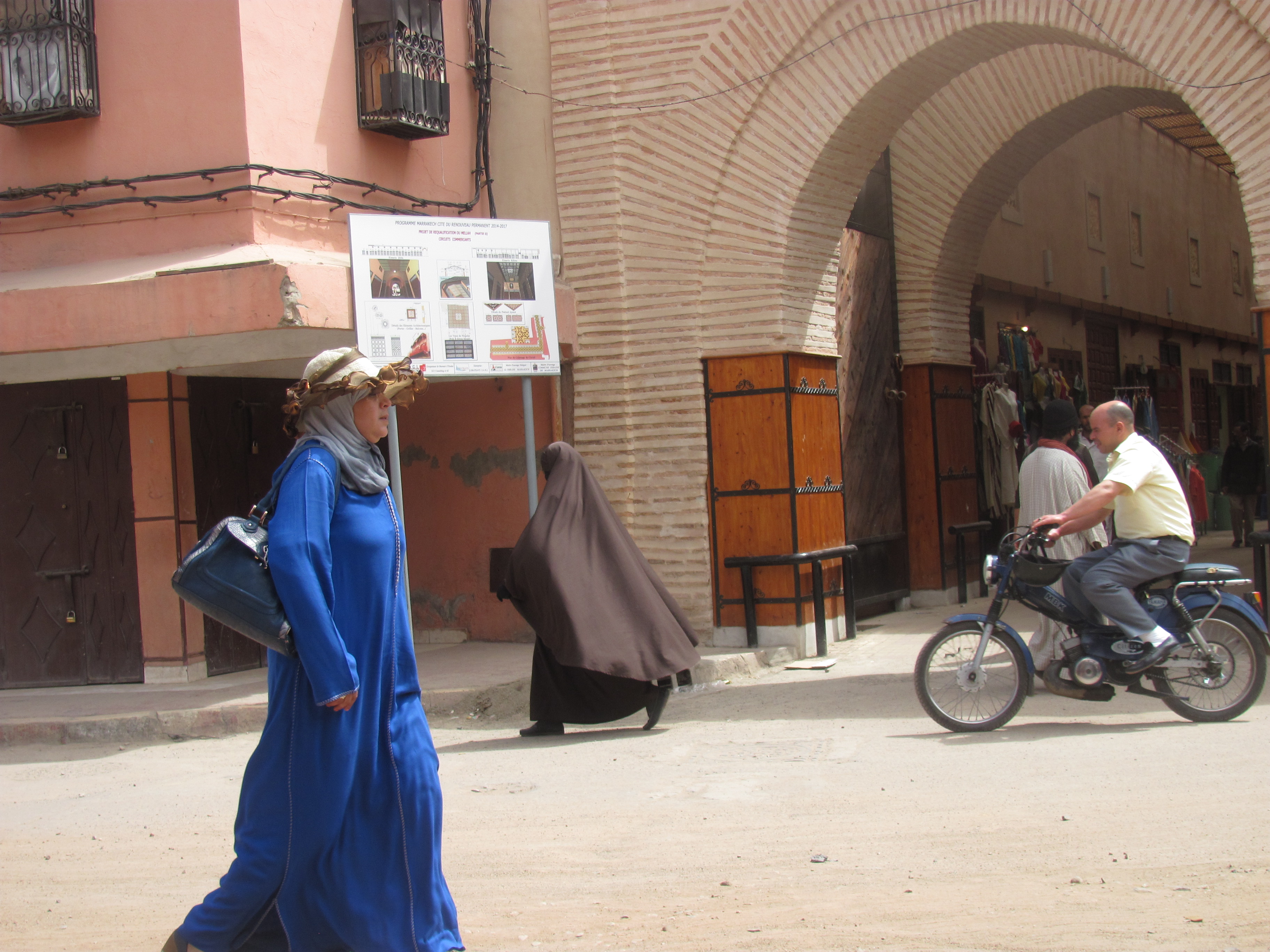 The various modes of dress exhibited by both the men and women were not just a source of fascination for me but also one of puzzlement. Clothing is probably the most visible way of expressing the mix of the traditional with the modern for which Morocco is famous. Most men dress in the western style resorting to the traditional for certain occasions. In the medinas it is common to see them dressed in a jellaba, a wool or cotton garment with a hood, especially in the early mornings for warmth. Babouches or leather slippers with long pointed toes and an open backs are also popular. The fashion styles for women, however, are a very mixed bag. Except for Casablanca, a more modern city, most of them wear a scarf or head covering which can be black or any other colour or design. From the neck down it might be a long dress of any colour or jeans. Those dressed from head to toe in black were rare in the cities but more common in the rural areas. The kids, however, all wore western dress. Apparently the choice to wear traditional or modern dress comes later in life and is a personal decision. To quote one young woman with impeccable English, dressed in jeans and no scarf of any kind who told us when we asked her how she had made her decision, she replied: “It’s a choice I will make to wear a veil or scarf based on my relationship with my God.” She has not ruled out the possibility of adopting the scarf in the future. Does this suggest that as women mature they are likely to become more religious, or perhaps it’s simply a way for them to express their freedom in an area which they haven’t had much say in the past. Traditionally, the mosques have always been dominated by the men while the women kept their beliefs hidden and focussed on their families.