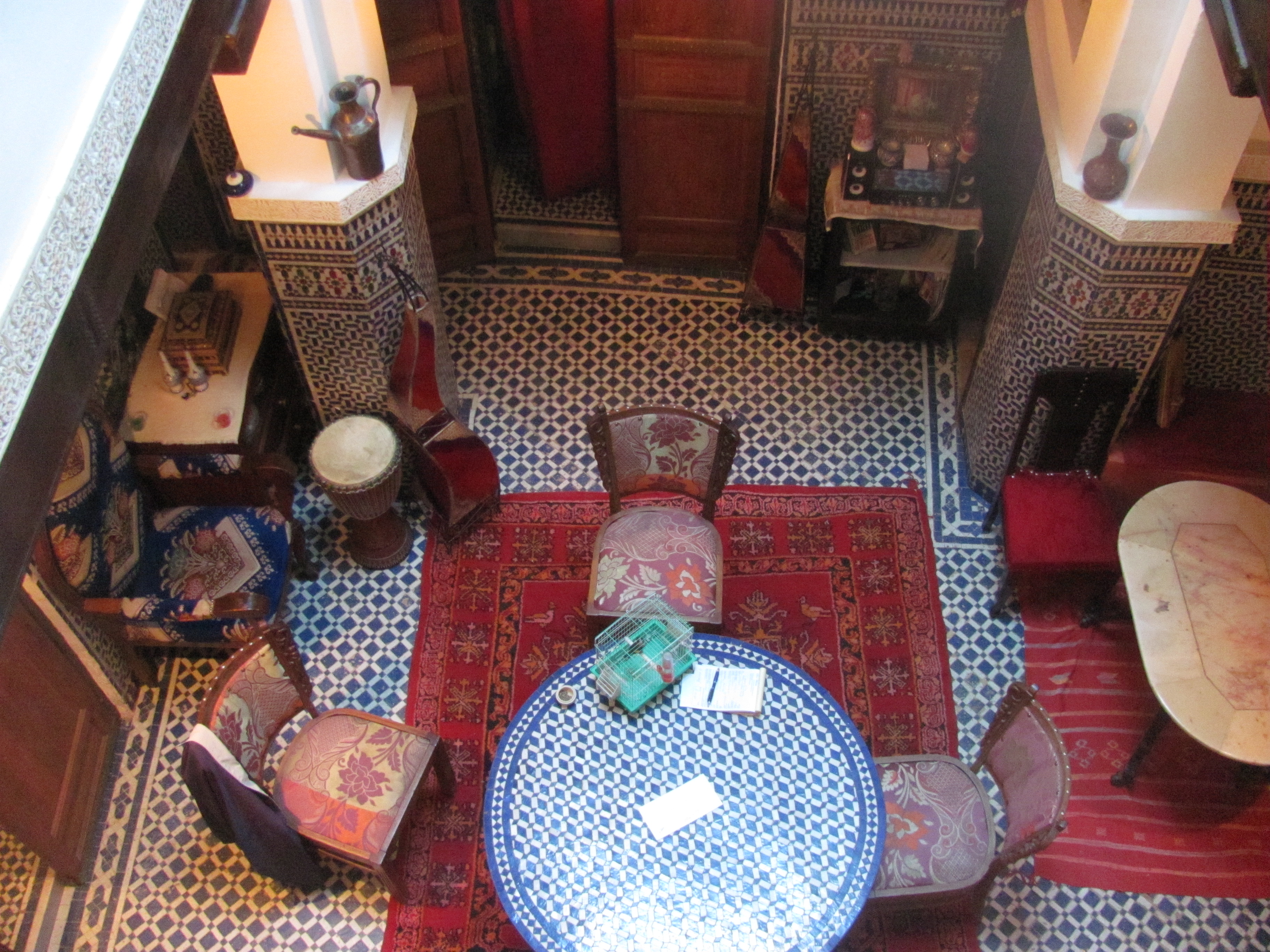 Looking down from the 3rd level of our riad in Fez to the central area where we ate our breakfast and chatted with our host and other guests.