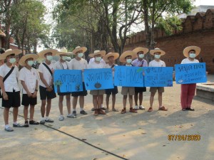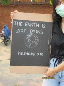 There were two obvious leaders of this event: a young man and a young woman who were probably university students. After banners and placards had been distributed to those who didn’t bring their own, the gathering was called to order with questions directed to us, such as:  What is global warming? How is it driving climate change? What causes global warming?  What greenhouse gases are responsible for it? This was done first in Thai followed by a shorter version in English which was a definite plus for me and the others who don’t speak Thai.