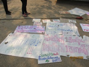 Meeting them was helpful because I thought that if they had received wind of the event, there had to  be others who did. Sure enough in a few minutes, I spied some activity happening over to the left of the gate so I went over to check it out. Aah…this looked more promising!  A group of young Thai were busily laying out banners and signs in both Thai and English sporting the words…climate change.