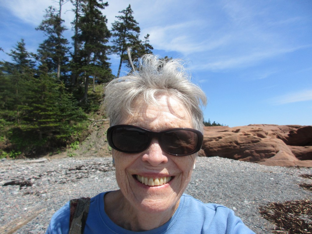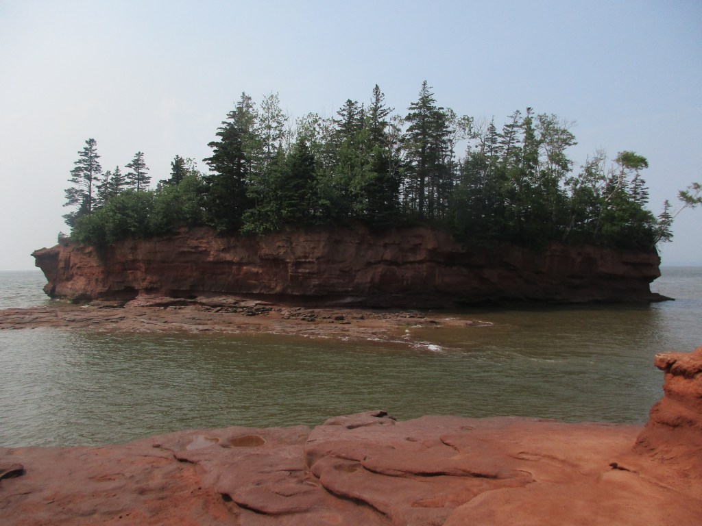 Spotting an eye-catching sign naming a place called Burntcoat Head, a place I had never heard of before, I decided to stop. Here I got my first glimpse of the unique rock formations, commonly called ‘flower pots’ which the Bay of Fundy is famous for in the southern part of New Brunswick. Unfortunately, the tide was on its way in so I couldn’t walk the ocean floor to look for fossils. Signs were posted everywhere reminding us to not go down the steep stairs since the tide comes in so quickly and can leave you stranded.